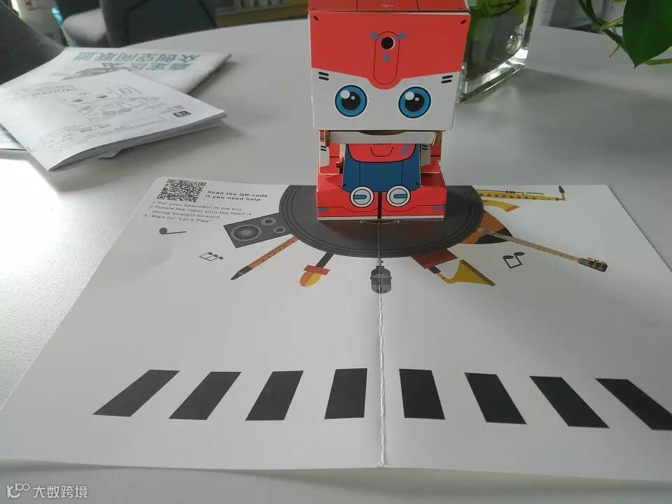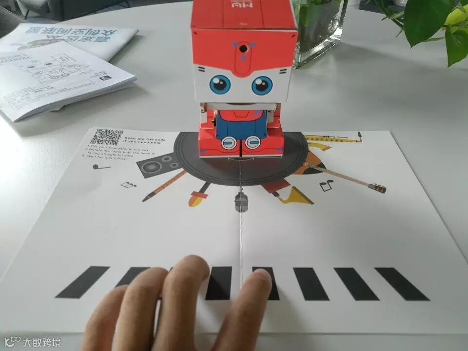 2.智能演奏模式:把小MU太空机器人放到纸板中的白色区域,捂住机器人的摄像头2~3秒,听到“Let’s play”进入该模式,对黑色方块进行遮挡,即可演奏音乐。