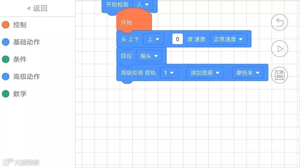 一段“机器人检测人就摇头并且播放摩托车声音”的程序