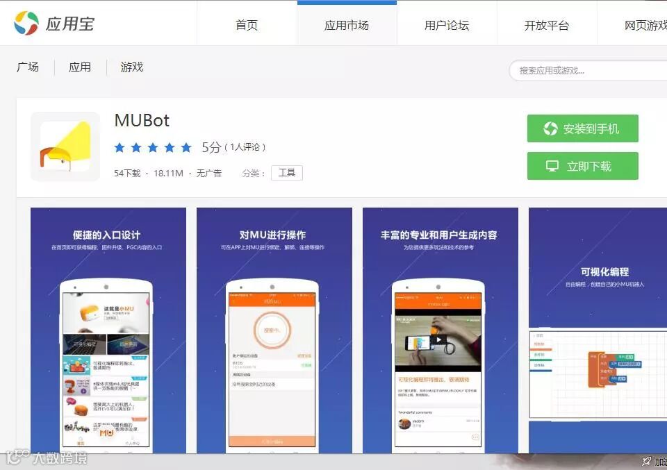 MU Bot机器人APP下载,由于说明书给出的二维码是来自Google Play,所以国内用户最好是直接上应用宝下载,搜索“MUBot”即可。