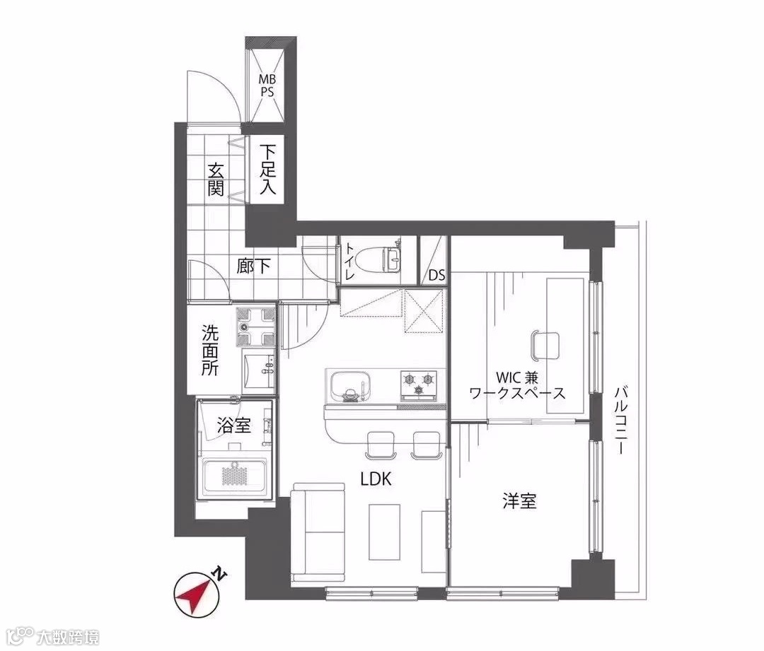 面积:1LDK➕步入式衣帽间(兼办公区),专有面积42.51平米;