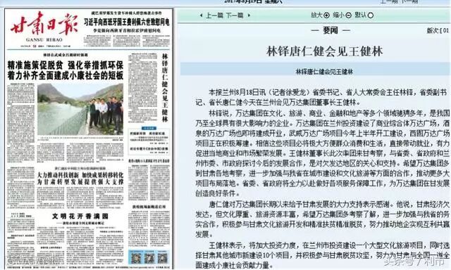 先是8月19日,《甘肃日报》在头版位置刊登了一篇题为《林铎唐仁健会见王健林》的报道,而这也是“世纪大交易”之后,地方省委领导会见王健林后地方党报首次报道。这篇文章还被人民网甘肃频道和人民网主办的中国共产党新闻网转载。