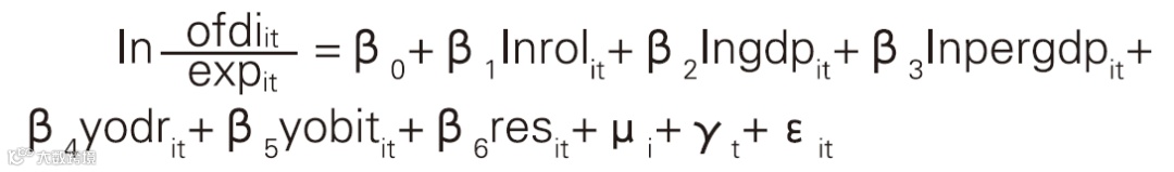 其中,i代表东盟国别个体,t代表年份;ofdiit/expit代表中国对东盟国家的投资出口比;rolit代表东盟国别法治环境质量;gdpit代表国别市场规模;pergdpit代表国别劳动力成本;yodrit代表与中国建交年数;yobitit代表与中国BIT生效年数;resit代表国别自然资源禀赋;μi为不可观测的个体效应;γt为时间效应;εit为随机扰动项。