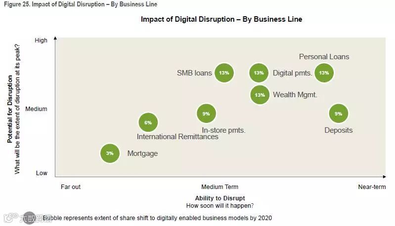 金融科技公司向第三方支付、P2P借贷和财富管理发力,必将与银行的零售业务争食,而这一块“长尾市场”恰恰是银行最容易被颠覆的。银行业发达玩家众多的欧美市场也许还不是特别明显,中国的支付和借贷发展迅速,在用户量上已经可以和银行分庭抗礼。