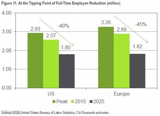 而这一改变的结果是:银行业对员工的需求量会急剧减弱,未来十年欧洲和美国银行的人员需求量将分别缩减40%和45%。