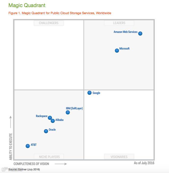 Google相比于去年,在Gartner的魔力象限中位置有所下滑,分析师认为,Google的存储服务仅在四个地域可用,同时Google在美国之外的数据中心并未覆盖云存储的主要市场。