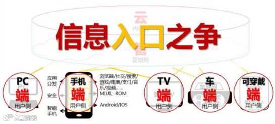 从互联网时代以来,用户的上网入口一直都是商家的必争之地(参见上文的盈利模式)。所谓的入口,就是分发内容的渠道,谁能成为内容渠道,谁才能成为入口。PC端是最早瓜分完成的入口,之后是围绕手机端展开的入口之争。谷歌和苹果的操作系统之争、分发之争、安全之争、硬件之争。手机端的争夺也已经基本完成了。Facebook的分享和微信WeChat的朋友圈以及群组,已经成为用户取得内容的主要管道。在手机上门户网站和搜索引擎都不再是主要入口,通讯软件或社交媒体才是用户的主要入口。