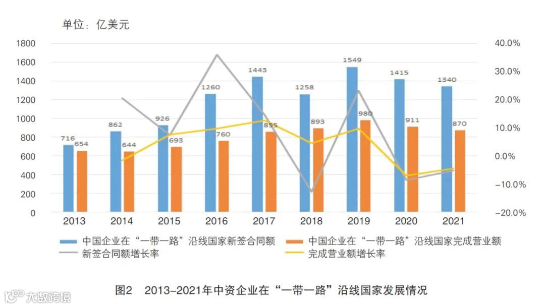 从2013-2021年我国对外承包工程行业发展趋势上看(如图1),海外新签合同总额由2013年的1716亿美元增长至2021年的2585亿美元,年均增长5.3%;海外完成营业额由1371亿美元增长至1549亿美元,年均增长1.5%。其中,新签合同总额在2017年达到峰值(2653亿美元),完成营业总额在2019年达到峰值(1729亿美元)。受新冠疫情影响,对外承包工程业务规模在2020年明显下滑,但在2021年实现回稳,新签合同额2584.9亿美元,同比增长1.2%;完成营业额1549.4亿美元,同比下降0.6%。显然,近十年来我国对外承包工程业务规模保持高位运行,国际市场份额稳步提升,夯实了我国对外承包工程的行业基本盘。