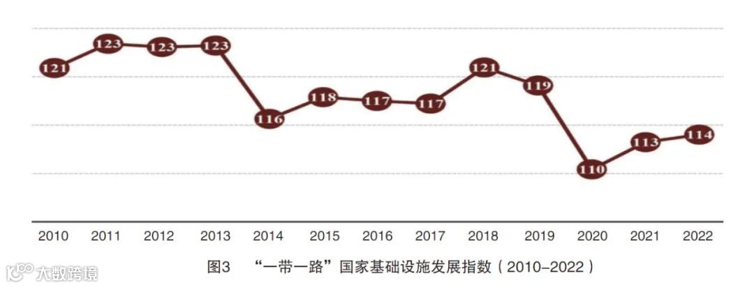 据去年中国对外承包工程商会、中国出口信用保险公司联合发布的《2022“一带一路”国家基础设施发展指数报告》显示(如图3),受全球经济复苏和新冠疫情冲击放缓等利好影响,“一带一路”重点国家(包括63个沿线国家和8个葡语国家)基础设施发展环境逐步改善、发展需求得到释放、发展热度有所回升(但仍未恢复到2018、2019年的相对高点)。