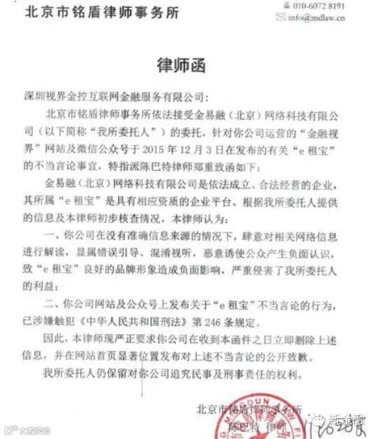 截至目前,据悉e租宝委托的律师也向率先曝光e租宝被查消息的“金融视界”发去了律师函(网友提供的截图)。相信e租宝这回是认真了,非要和媒体理个是非曲直。相信随着事情的深入,更多的猛料或许将被一一带出。