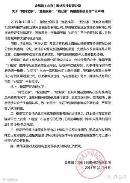 e租宝方面也未宣称对此事负责。但就在12月4日,已经两发两个公告的e租宝方又发出了一篇声明,称会对参与“虚假报道”的媒体进行维权,其中重点点名了“出力最多”的网贷之家。