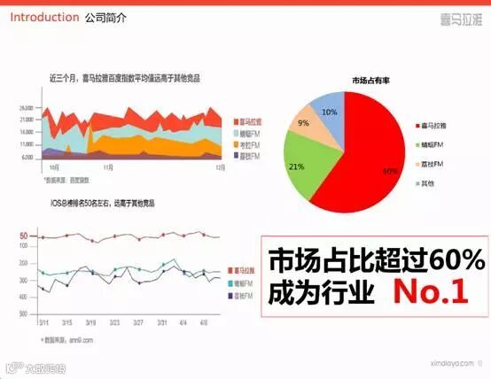 而这一切的源起,要归结为喜马拉雅FM在融资文件中(自家融资方案和给到外部私募公司的融资计划书等)中宣称“老子天下第一”的自嗨:市场占比60%,成为行业遥遥领先的No.1。