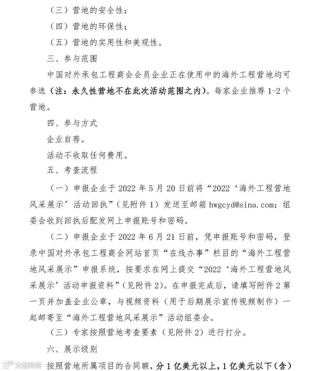 (一)申报企业于2022年5月20日前将“2022‘海外工程营地风采展示’活动回执”(见附件1)发送至