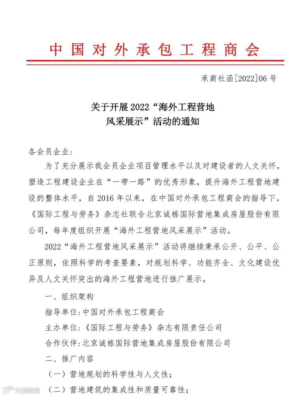 2022“海外工程营地风采展示”活动将继续秉承公开、公平、公正原则,依照科学的考查要素,对规划科学、功能齐全、文化建设优异及人文关怀突出的海外工程营地进行推广展示。