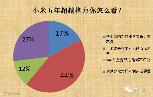 尽管44%的人认为小米吹年,但我们也不得不承认,在雷布斯带领下,经过几年积累,小米手机的品质有了很大提升。米4的发布是一个转折,产品不再单纯地追求硬件的高配,而是着力渲染物理工艺与软件体验的同步升级,这是理性的回归,也是蜕变的开始。而定下了”软件+硬件+互联网“宏伟目标的小米,未来重点不应是各种口水仗,而应是集中精神做出让用户惊艳的产品。选择伟大,还是走向平庸,关键在此!