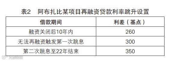 以阿布扎比某项目为例,其官方出口信用保险机构覆盖部分之外的再融资贷款利率跳升设置如表2。