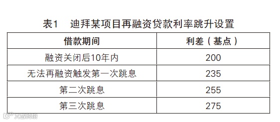 1. 利率随时间跳升再融资贷款的贷款利率随项目年限逐步跳升,通过提高融资成本以敦促借款人尽快实施再融资、保持融资银行满足拉长期限后的成本要求。以迪拜某项目为例,其利率跳升设置如表1。