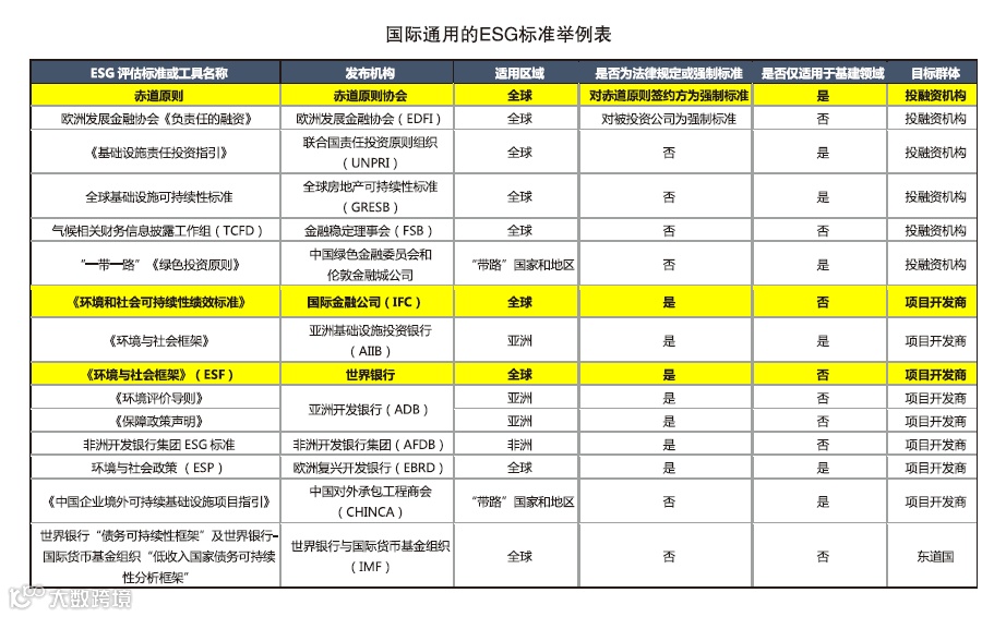 金融机构最常用来评估基础设施项目的三套E SG标准与框架包括:赤道原则协会推出的《赤道原则》、世界银行成员机构国际金融公司(IFC)发布的《环境和社会可持续性绩效标准》(IFC《绩效标准》),以及世界银行颁布的《环境与社会框架》。