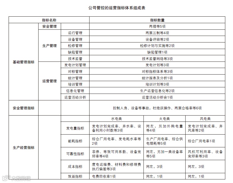 根据对公司所属电厂生产运营实际情况及海外环境特点,在对实践经验进行总结的基础上,建立的公司运营指标体系包括基础管理指标、安全管理指标、生产经营指标三大类,具体如下页表。