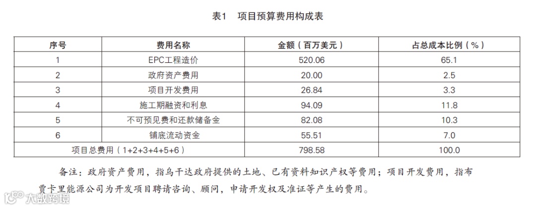 项目预算总投资7.99亿美元。EPC造价5.2亿美元,占比65.1%,为最大成本。政府资产费用、项目开发费用、施工期融资和利息、不可预见费和还款储备金、铺底流动资金,合计2.79亿,占比34.9%。详见表1。
