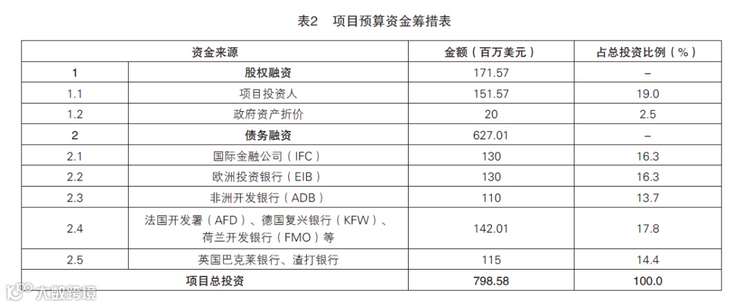 第三,合理利用多边、双边金融机构对发展中国家基础设施的支持政策,进行项目的融资。投资人以21.5%的股权投资,撬动了 78.5%的债务融资,充分发挥了资本的杠杆作用。债务融资时,以国际金融公司(IFC)为牵头行,吸纳了欧洲投资银行(EIB)、非洲开发银行(ADB)、法国开发署(AF D)、德国复兴银行( KFW)、荷兰开发银行( FMO)等优惠信贷资金,贷款期长达 16-20年,降低了项目资金成本。