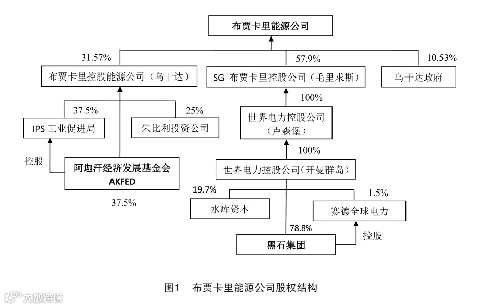 根据乌干达电力法案,乌干达政府于2004年经公开招标,选择了工业促进局( Industrial Promotion Services, IPS)和赛德全球电力公司( Sithe Global PowerLLC, SG)的联营体。前者于1960年由阿迦汗经济发展基金会设立,意在为东部非洲国家私人企业提供风险投资、技术协助和管理支持,其股东还包括世界金融公司(IFC)、德国投资与发展有限公司(DEG)等机构。后者于2004年由美国水库资本集团(Reservoir Capital)设立,意在开发、建设、持有和运维全球战略电力资产;2005年和2010年,美国黑石集团两次购进其股份,并达到99%绝对持股。项目公司股权结构如图1。
