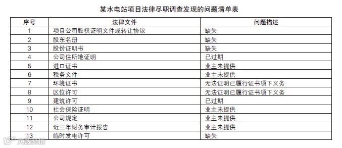 该项目开发商为印尼当地公司,业主已取得项目的所有开发权,并完成了项目的征地移民工作、项目可行性研究报告及详细设计工作,处于与印度尼西亚国电公司(PLN)进行购电协议(PPA)谈判的阶段。中国某投资公司开始对本项目及项目公司开展尽职调查,经过数月的调查,发现项目及项目公司的主要问题见下表。