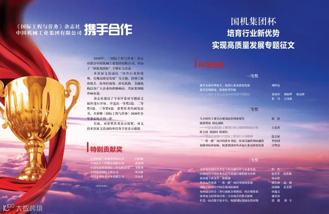 2020年,《国际工程与劳务》杂志社联合中国机械工业集团有限公司,举办了“国机集团杯”专题征文活动。本次征文活动以“培育行业新优势,实现高质量发展”为主题,得到了政府机关、驻外经商处、研究机构、金融机构以及广大企业的积极响应,共征集到稿件80余篇。杂志社邀请了专家评委对专题征文稿件进行评审,评选出一等奖2篇、二等奖5篇、三等奖8篇。获奖作者均颁发证书,并获赠《国际工程与劳务》2020年全年杂志电子刊一套。在此,对获奖作者表示祝贺,对支持本次征文活动的单位及专家表示感谢。