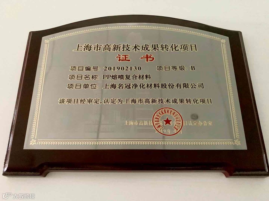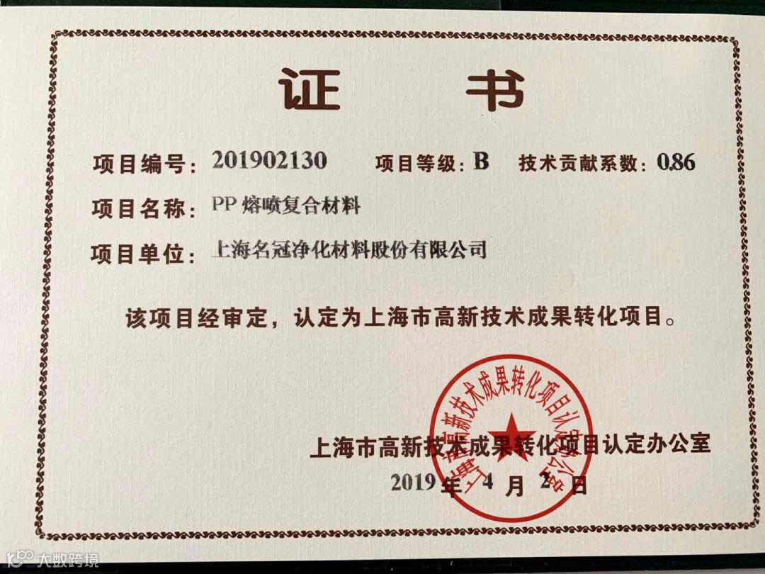 PP熔喷复合材料项目,被上海市高新技术成果转化项目认定办公室审定为上海市高新技术成果转化项目。