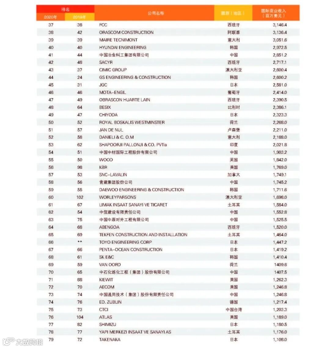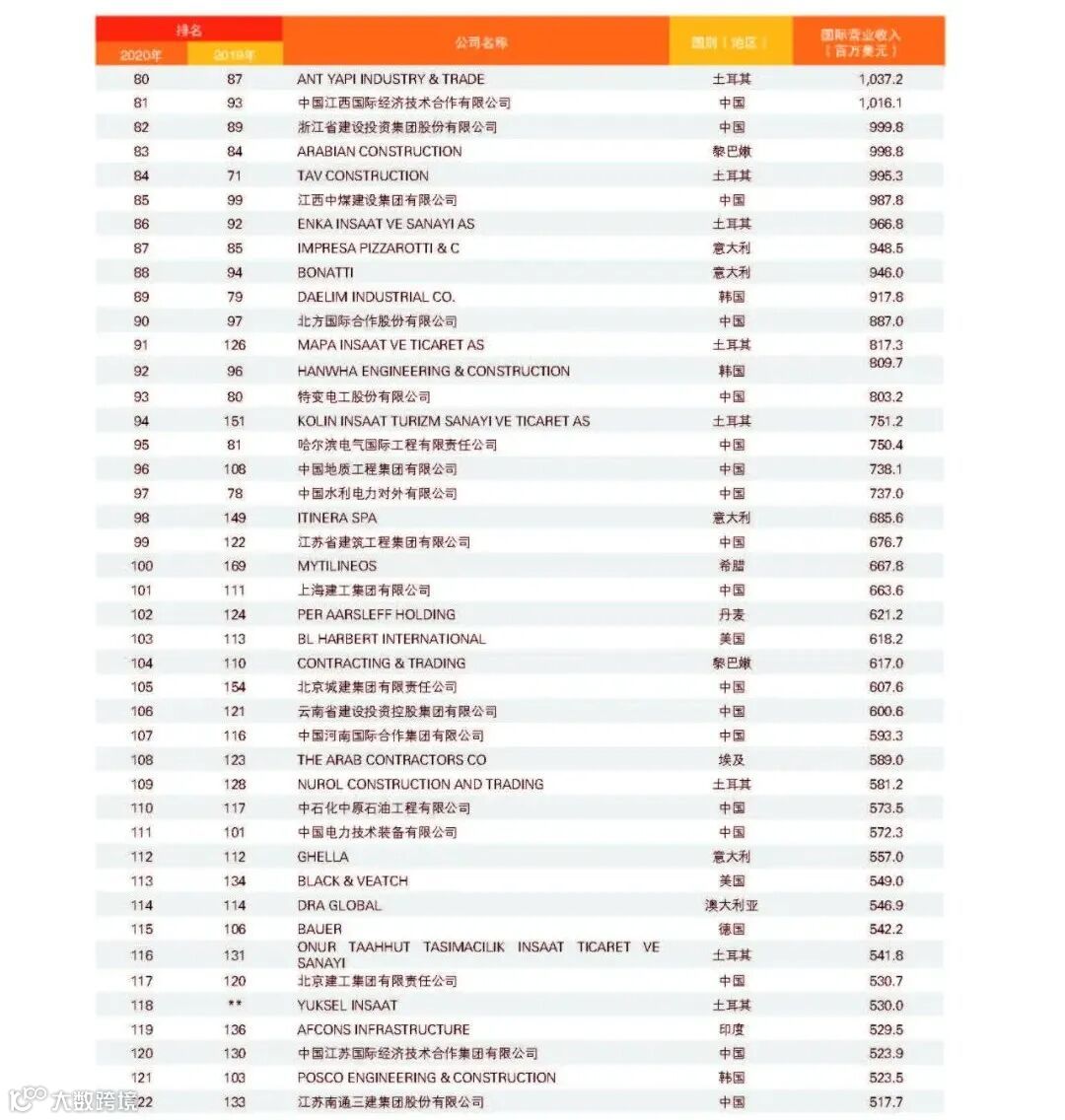 今年有12家韩国承包商入选,数量与去年持平;有44家土耳其承包商入选,比上年增加1家,土耳其承包商海外营业收入总额为216.39亿美元;有13家日本承包商入选,日本承包商海外营业收入总额为194.33亿美元。