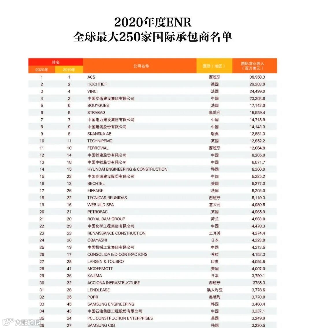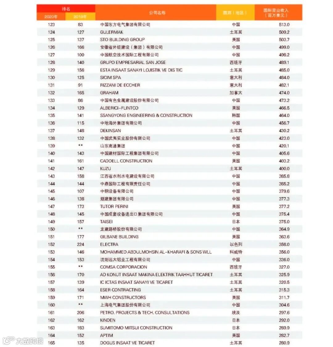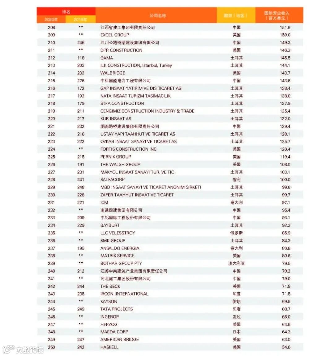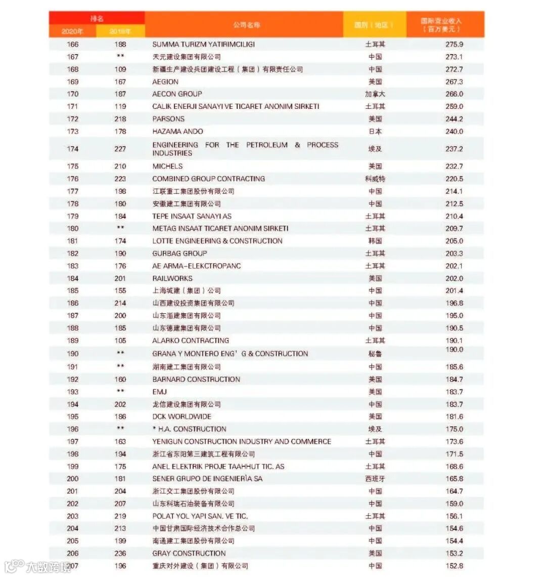 从中国企业来看,共有74家企业上榜,较上一年度减少1家,主要原因是部分企业实施了合并重组,由母公司统一参评。与2019年度相比,入围今年“全球最大250家国际承包商”的74家中国企业中,有37家排名上升,其中上升幅度最大的为北京城建,排名从第154位上升至第105位,其次为安徽外经,排名从第166位上升至126位;27家企业排名下降;2家与2019年度排名持平;新上榜企业8家,分别是山东高速集团、龙建路桥股份有限公司、上海电气集团股份有限公司、天元建设集团有限公司、湖南建工集团有限公司、江西省建工集团有限公司、南通四建集团有限公司、河北建工集团有限责任公司。在新上榜企业中,山东高速集团与龙建路桥表现较为亮眼,进入排名前150强,排名分别为第139位和第150位。