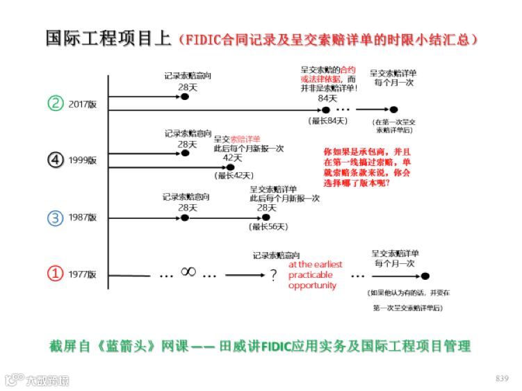 FIDIC不同版本索赔的时间限定分别是:1987年第四版第53款/ Procedure for Claims [索赔程序] —— 如果承包商想进行索赔,在索赔事件出现后的28天内必须书面通知索赔意向,并一定要在发出该索赔意向后的28天内呈交索赔详单,缺一不可。 1999版第20.1款/ Contractor’s Claims [承包商的索赔] —— 承包商在知晓到(或应当知晓到)出现了索赔事件后的28天内必须书面通知索赔意向,并一定要在其知晓到(或应当知晓到)引起索赔事件后的42天内呈交索赔详单(请特别注意是从第一天数,而不是从第28天数),缺一不可;2017版第20.2.1款/ Notice of Claim [索赔通知] 和20.2.4款/Fully Detailed Claim [详尽索赔] —— 承包商在知晓到(或应当知晓到)出现了索赔事件后的28天内必须书面通知索赔意向,并一定要在其知晓到(或应当知晓到)引起索赔的事件后的84天内呈交 “a statement of basis of contractual and/or other legal basis of the claim”(索赔的合同法理依据);这里需要指出的是,这第二个从第一天数起的84天内只是需要交上“索赔的合同法理依据”(而无需呈交索赔详单),承包商如果在84天内没呈交正确的“索赔的合同法理依据”(对此需要认真斟酌确定,因为这将成为未来索赔的方向和出发点),就可能丧失原有合同权益 —— 这也非常重要。