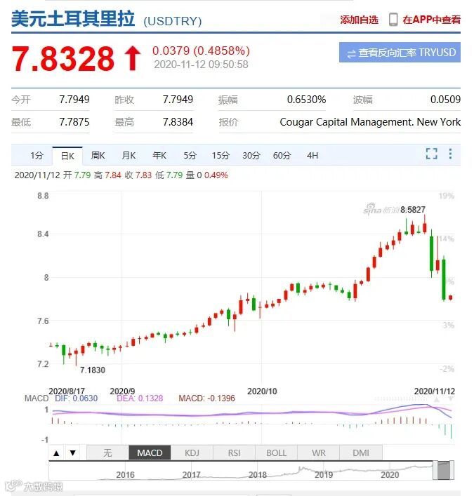 总统埃尔多安发表讲话后,土耳其里拉兑美元汇率最高升值3%,至7.9里拉兑1美元。并在下午6:30停留在7.85。伊斯坦布尔证券交易所(BIST)基准BIST 100指数也飙升了2.38%,在当地时间下午3:40创下了1,272.63的历史新高。并且持续上涨,收盘上涨2.91%,达到最高收盘价1,279.22。2020年11月12日,里拉再次升值,至7.83里拉兑1美元。