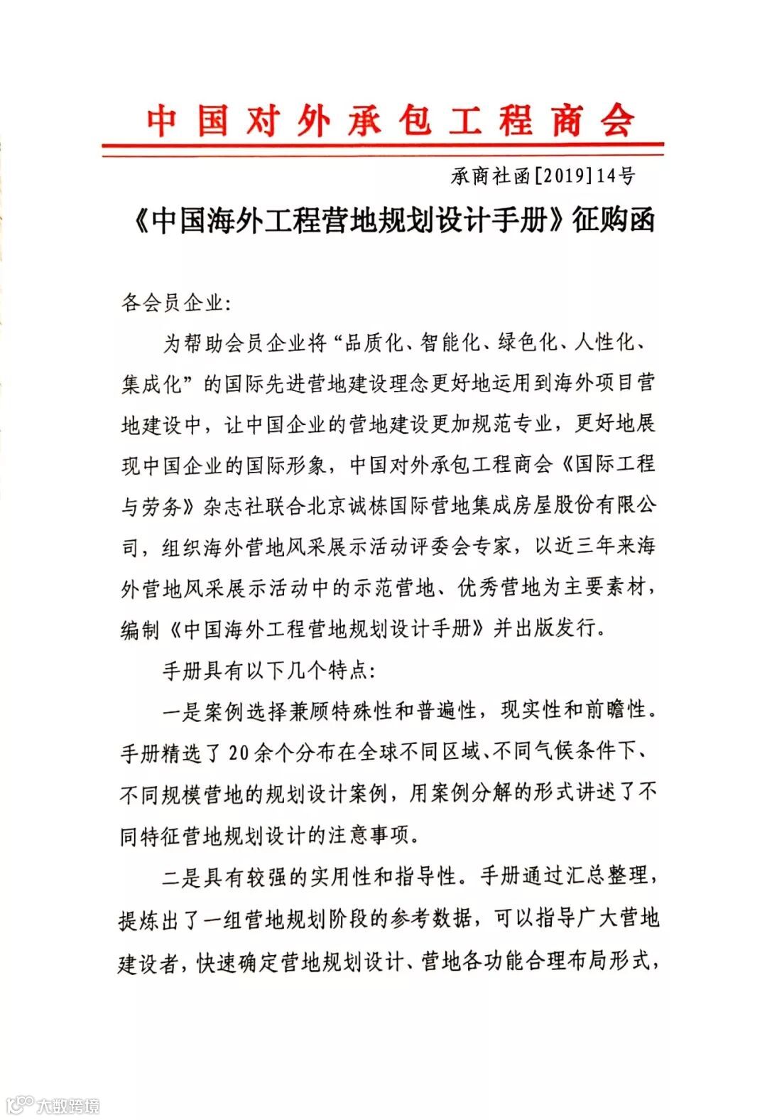 为帮助会员企业将“品质化、智能化、绿色化、人性化、集成化”的国际先进营地建设理念更好地运用到海外项目营地建设中,让中国企业的营地建设更加规范专业,更好地展现中国企业的国际形象,中国对外承包工程商会《国际工程与劳务》杂志社联合北京诚栋国际营地集成房屋股份有限公司,组织海外营地风采展示活动评委会专家,以近三年来海外营地风采展示活动中的示范营地、优秀营地为主要素材,编制《中国海外工程营地规划设计手册》并出版发行。