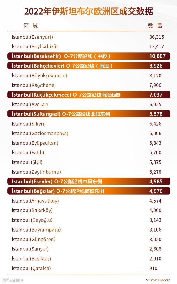 伊斯坦布尔O-7高速路沿线为新兴CBD区,近些年发展迅猛,人口数量超300万以上居欧洲区前列,房产需求大,交易量大。这里也是欧洲区房产交易量最多且最活跃的区域之一,占整个欧洲区房产销售量的四分之一。新兴CBD区域的住宅房屋总成交量和二手成交量可实现双高。