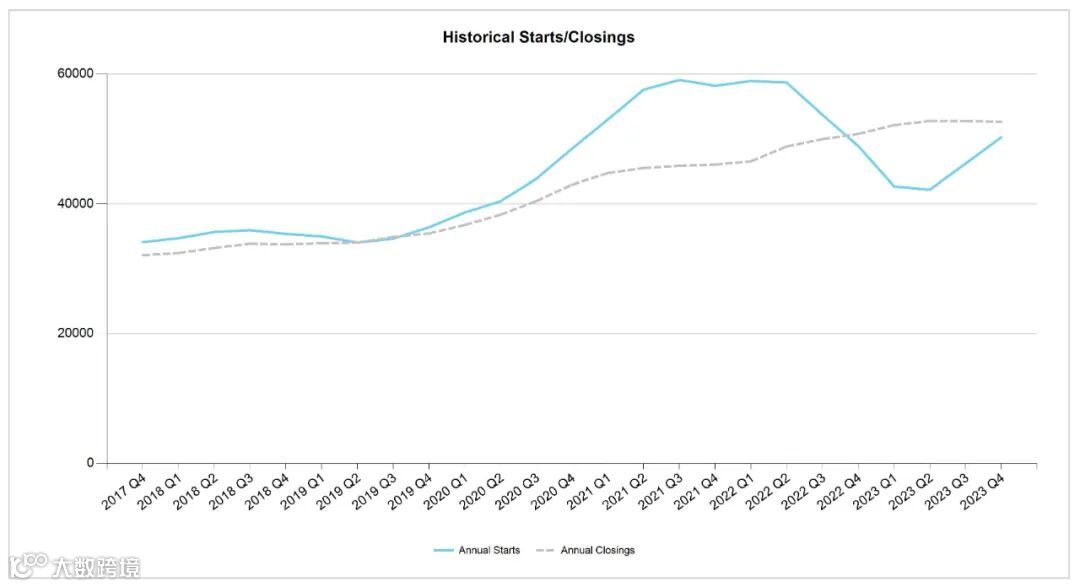 北德州建商在23年四季度新屋开工量方面再次实现强劲增长,该季度共开工建设12,173套房屋,同比增长50%(22年4季度新屋开工量为8,107套)。22年四季度主要由于未售房屋库存的上涨而导致建商新屋开工量下调,但这一阶段的库存多数在23年一季度已被市场消化。23年四季度的开工量节奏与本年度二、三季度类似但更具季节性。