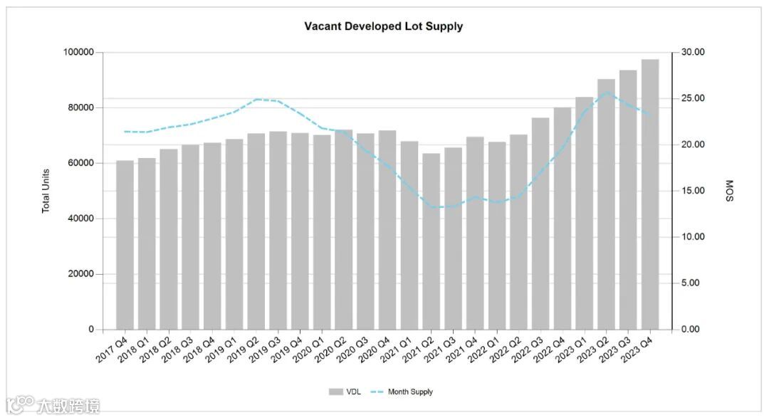 达拉斯-沃斯堡市场的待开发竣工地块数量持续增长。在23年末待开发竣工地块数量达97,847块,达到市场供需平衡的23.3个月去化周期。土地开发活动的快速上涨始于2021年末,表明在此前6个季度土地地块开发量高于新屋开工量。在此期间地块供应量从70000余块快速上涨至目前的近10万块。幸运的是,新屋开工量在此期间也开始加速,因此市场地块供应整体上维持供需平衡的健康水平。虽然如此,开发商仍应密切关注当前市场特殊的供需关系,在达拉斯-沃斯堡的部分细分市场地块供给紧张,而在部分细分市场则供大于求。