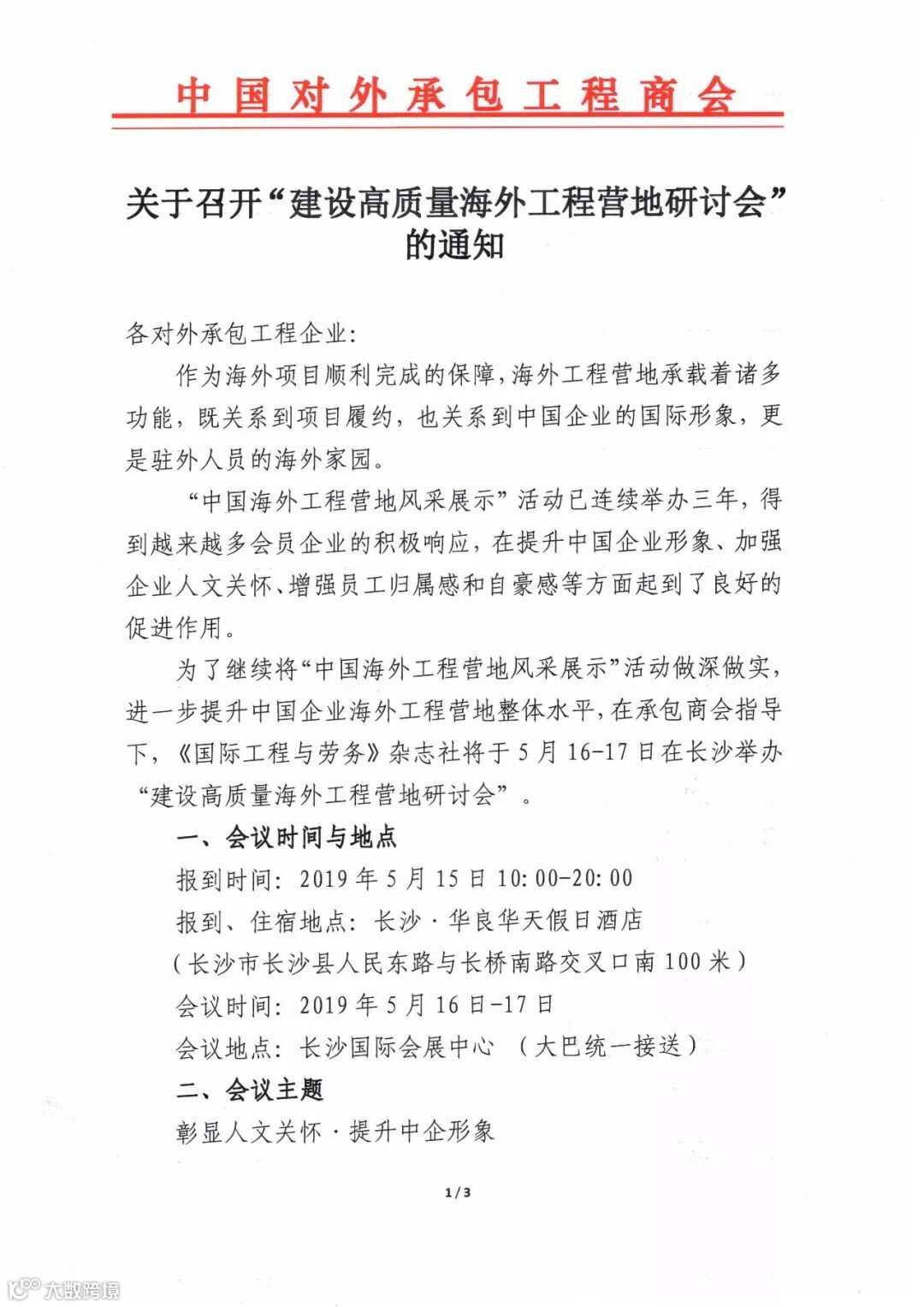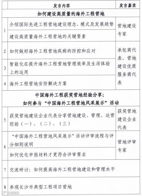为了继续将“中国海外工程营地风采展示”活动做深做实,进一步提升中国企业海外工程营地整体水平,在承包商会指导下,《国际工程与劳务》杂志社将于5月16-17日在长沙举办“建设高质量海外工程营地研讨会”。