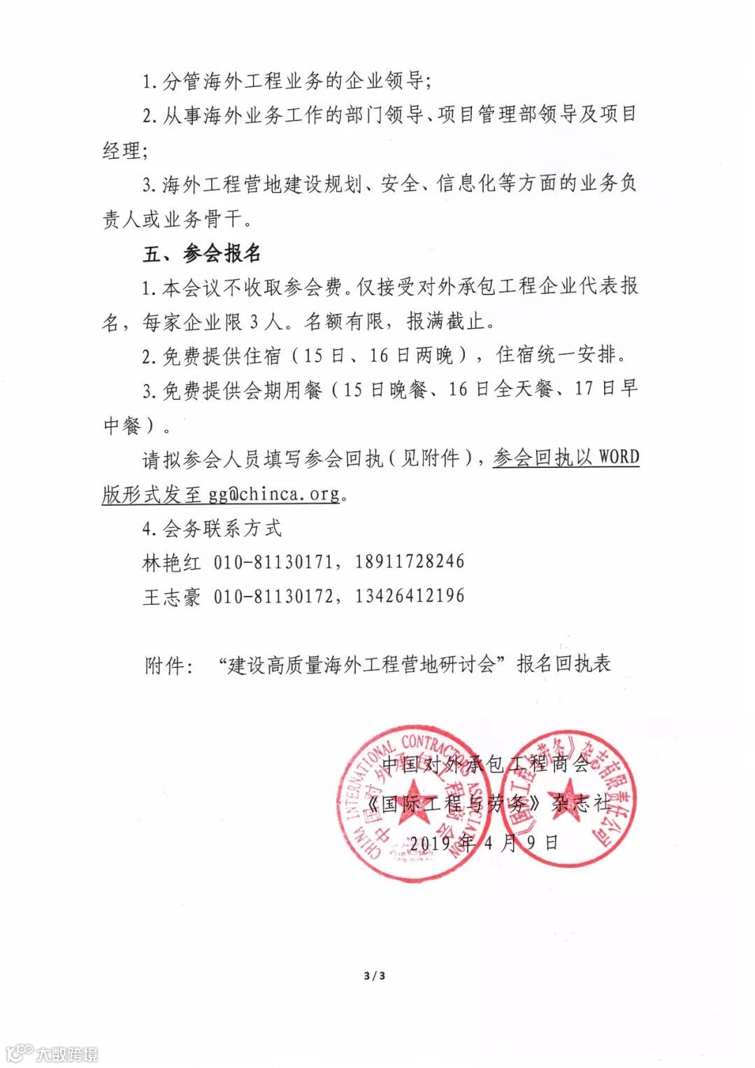 1.本会议不收取参会费。仅接受对外承包工程企业代表报名,每家企业限3人。名额有限,报满截止。