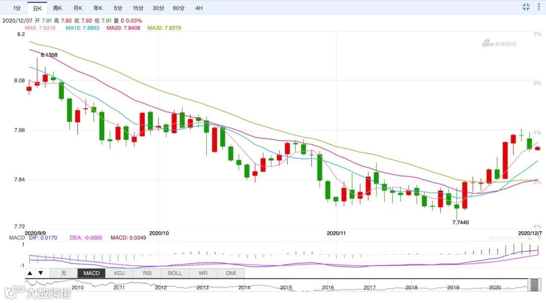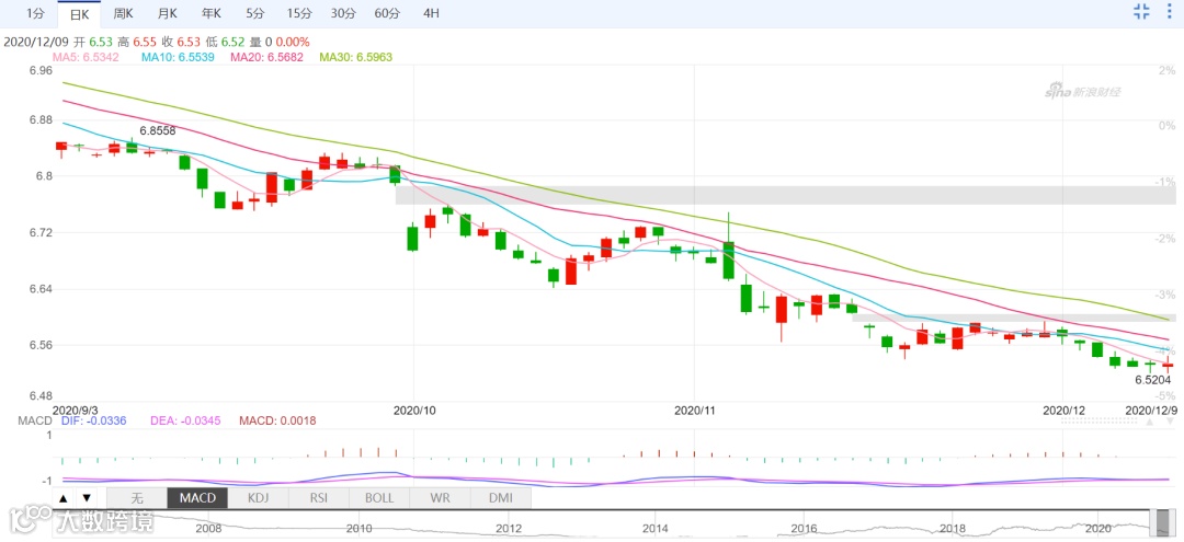 从2020年5月29日的7.17开始,作为避险货币的美元持续走弱,美元兑人民币波动性地下跌,至今依旧处于弱势,阶段内没有反弹迹象,短期内是“回7无力”了。