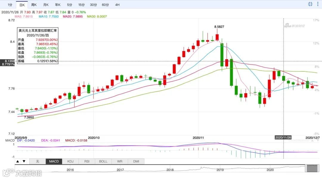 十一月初土耳其央行换行长,利率政策改变,市场看好,因此连续回调,7.5后出现反弹,在可预见的时间内,预期在7.5至8之间横盘震荡。