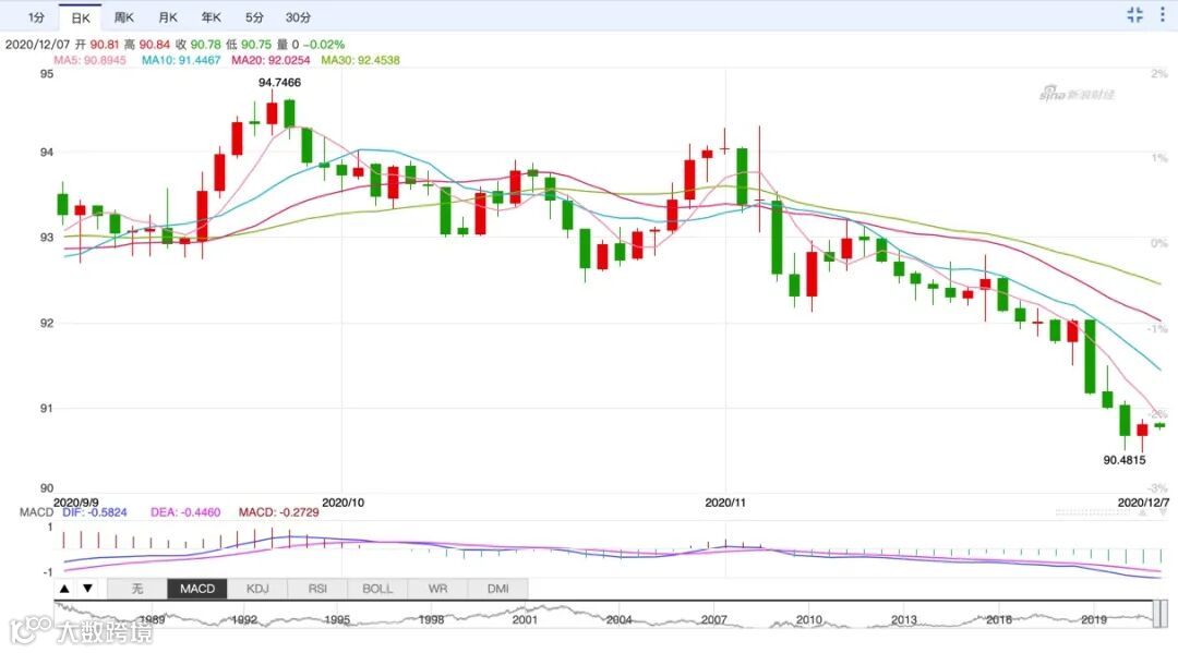12月6日,美元兑一篮子主要货币自3月份达到峰值以来已经下跌了近12%。上周,美元一度下跌至逾两年半低位90.504,11月下跌约3%,今年以来贬值近6%,可能录得2017年来最差年度表现。