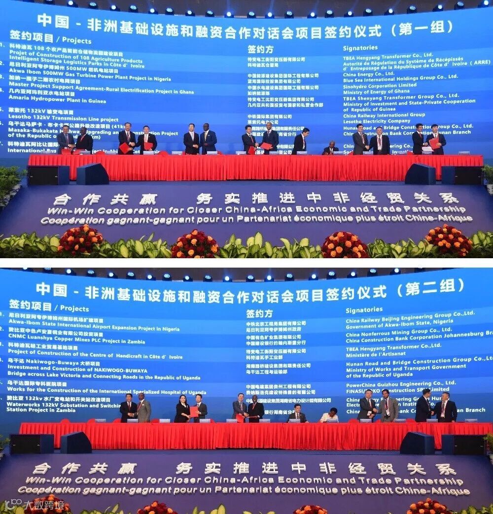 对话会上,还举行了中非基础设施合作项目的签约仪式。在项目签约仪式上,签署了尼日利亚蓝海国际伊博姆电厂二期项目、加纳一揽子二期农村电网项目、几内亚阿玛丽亚水电站项目、乌干达ISHU医院项目等共计13个项目,合同金额约25.71亿美元。