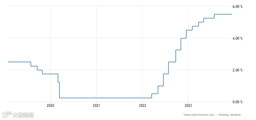 2023年7月,美联储将联邦基金利率目标区间升至了5.25%-5.5%,全年累计加息幅度达到了100基点。而自2022年3月启动本轮加息以来,美联储累计加息幅度达到了惊人的525个基点。