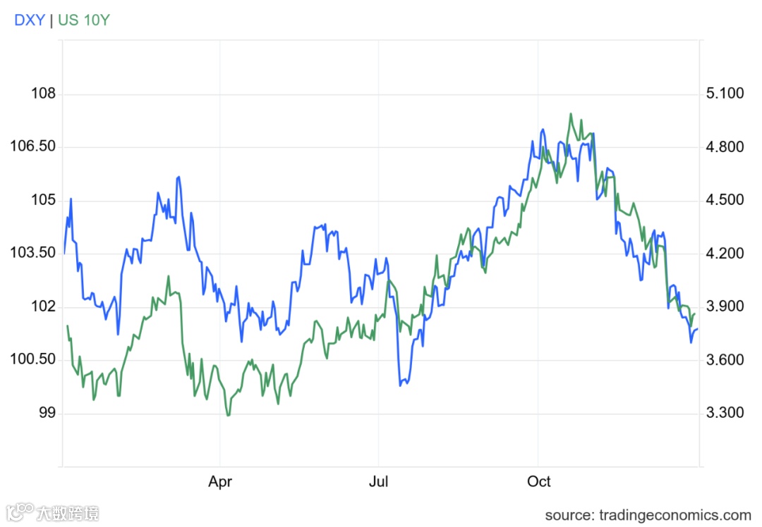 (美元指数与10年期美债收益率走势 来源:来源:tradingeconomics)