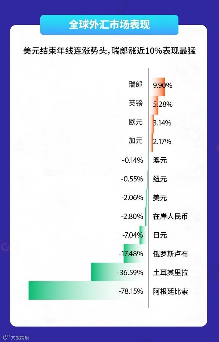 新兴市场国家如巴西雷亚尔和墨西哥比索汇率表现相当强劲,全年兑美元升值在10%以上。这是因为在全球供应链重新构建的背景下,两国出口和海外投资势头良好,导致其汇率表现强劲。