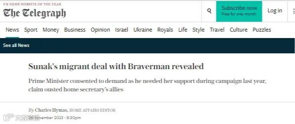 ▲《每日电讯报》:苏纳克与布雷弗曼的移民协议曝光