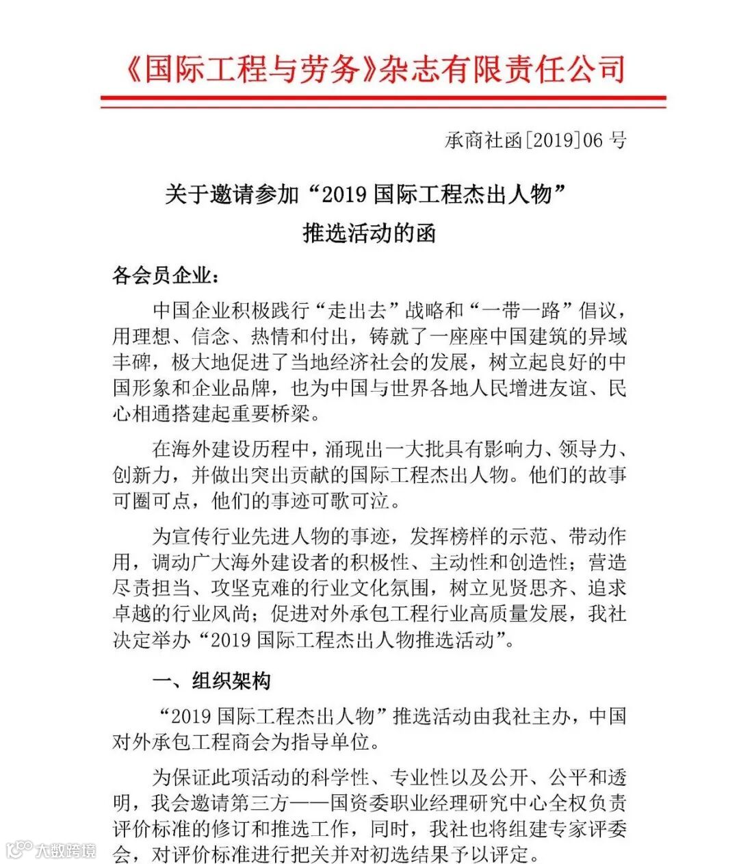 “2019国际工程杰出人物”推选活动由我社主办,中国对外承包工程商会为指导单位。