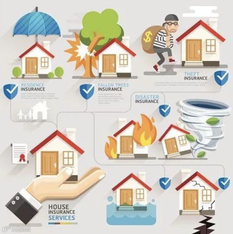 建筑保险为房产本身保险,这个保险涵盖了房屋的所有基本组成部分,包括厨房、浴室配件在内,并覆盖了火灾、水灾、甚至沉降等事故。