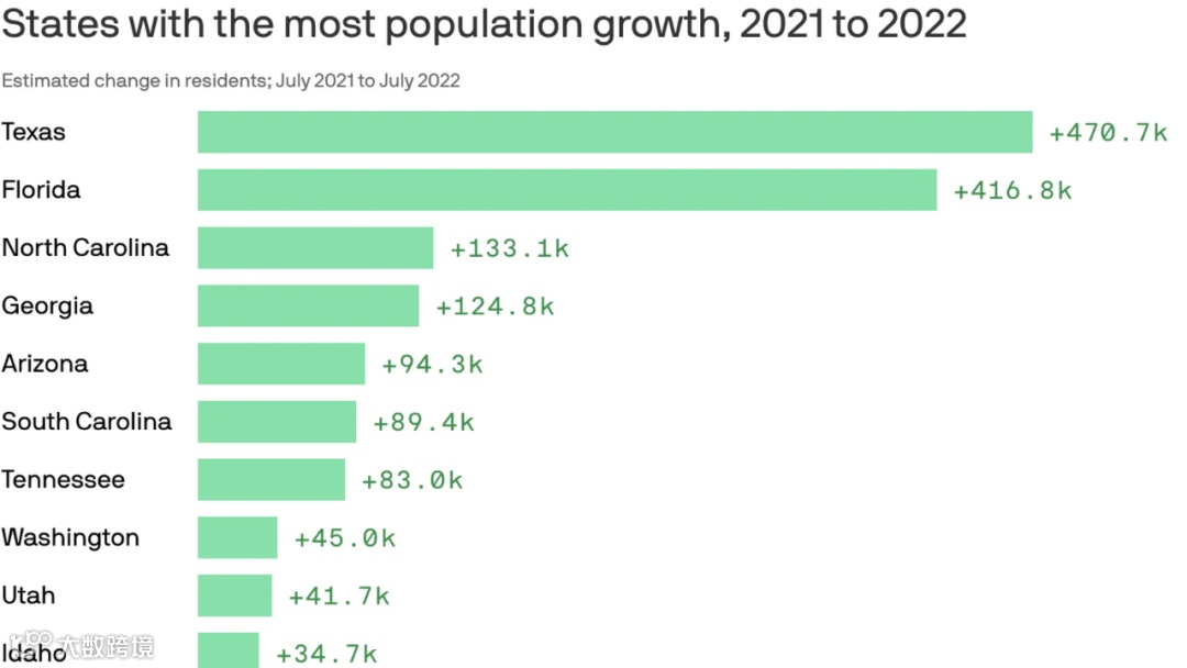 过去两年220万人搬迁至美国东南部,美国四大人口高增长地区位于南部;