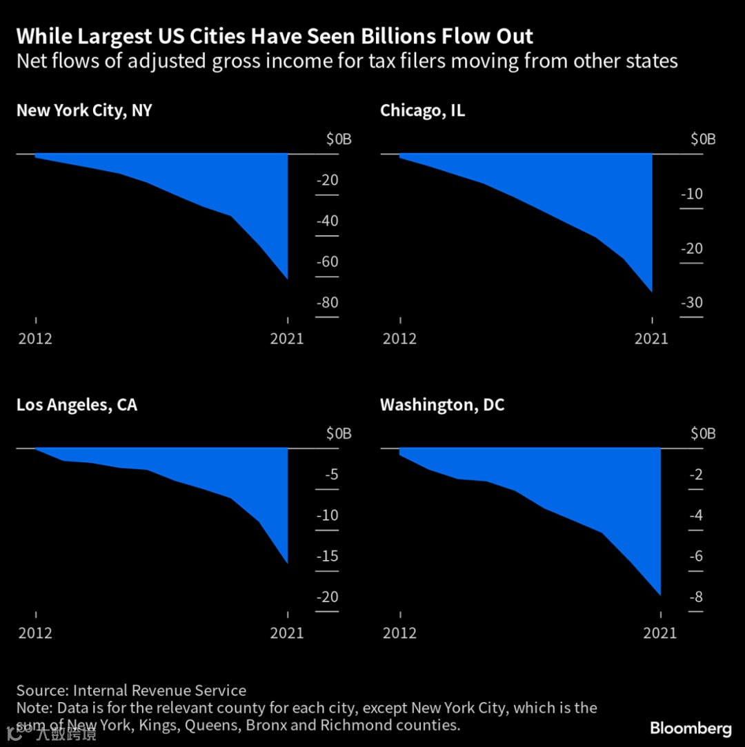 根据近期美国国税局(IRS)发布的数据分析,仅 2020 年和 2021 年期间,人口迁徙就为东南部地区带来了约 1000 亿美元的新增收入,而东北部则流失了约 600 亿美元。